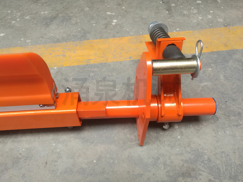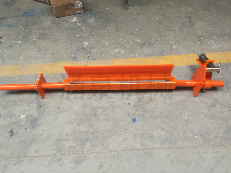 5. 安裝固定,使組裝好的清掃器軸心線與滾筒軸心線平行,刀頭緊貼帶面,然后調整使刀尖線的中心對準滾筒軸心線的中心,將橫梁底部的鎖緊螺釘擰緊并用螺母鎖定。通過調節螺母調整彈簧長度,給刀頭施加預緊力,然后用鎖緊螺母鎖緊。