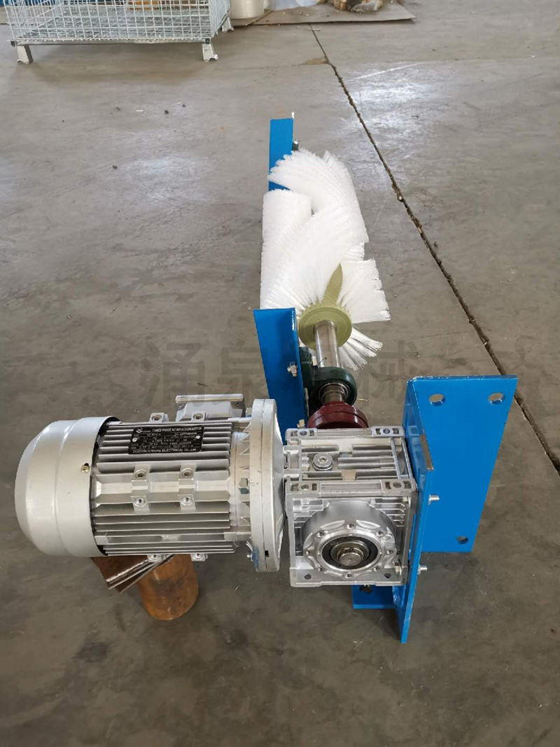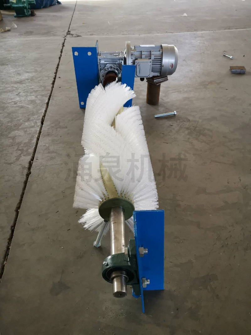 旋轉式清掃器位于輸送機回程輸送膠帶下方,有電動機或者驅動滾筒驅動圓柱型清掃刷,刷尖與帶面輕微接觸,清掃刷的旋轉方向與回程輸送帶的運行方向相反,從而將粘在帶面上的微料刷掃下來,達到徹底清潔的目的。
