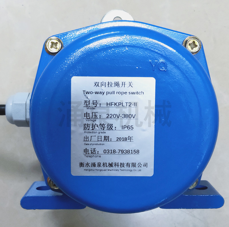 當(dāng)膠帶運(yùn)輸現(xiàn)場(chǎng)發(fā)生緊急事故時(shí),拉動(dòng)系在吊耳上的鋼絲繩,使機(jī)內(nèi)的滑塊與開(kāi)關(guān)作用,發(fā)出停機(jī)信號(hào)。松開(kāi)鋼絲繩按下復(fù)位杠后方可復(fù)位