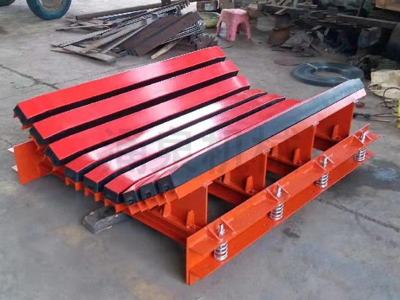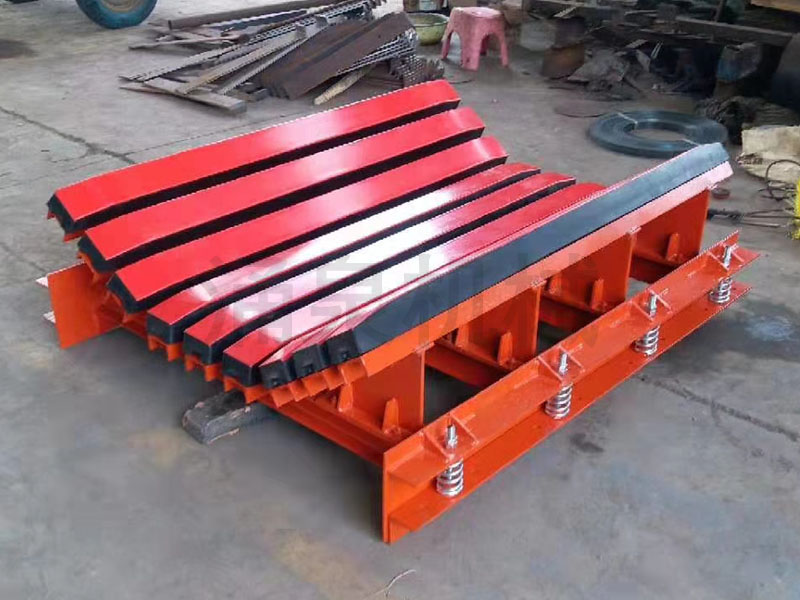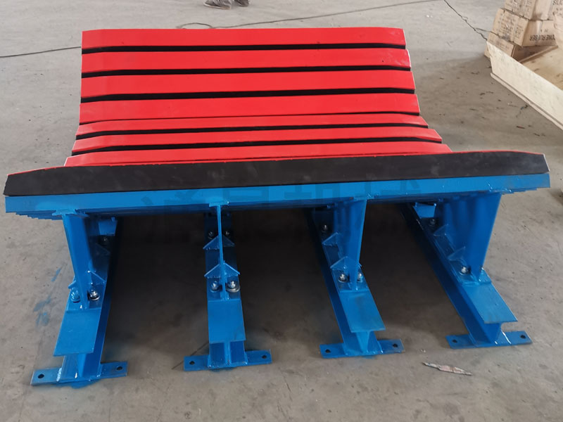 緩沖床主要有緩沖條、加強槽鋼、支架及連接件等組成。緩沖條由緩沖膠條和超高分子量聚乙烯經特殊工藝硫化而成。緩沖膠條由骨架和橡膠熱硫化而成,骨架由特型鋁合金制成,骨架主要用來提高緩沖條的強度和連接。加強槽鋼起支撐和保護緩沖條的作用。支架是根據皮帶機的規格大小、皮帶的槽型角設計制作,用來托住和固定加強槽鋼、緩沖條;最終架設在皮帶機機架上。